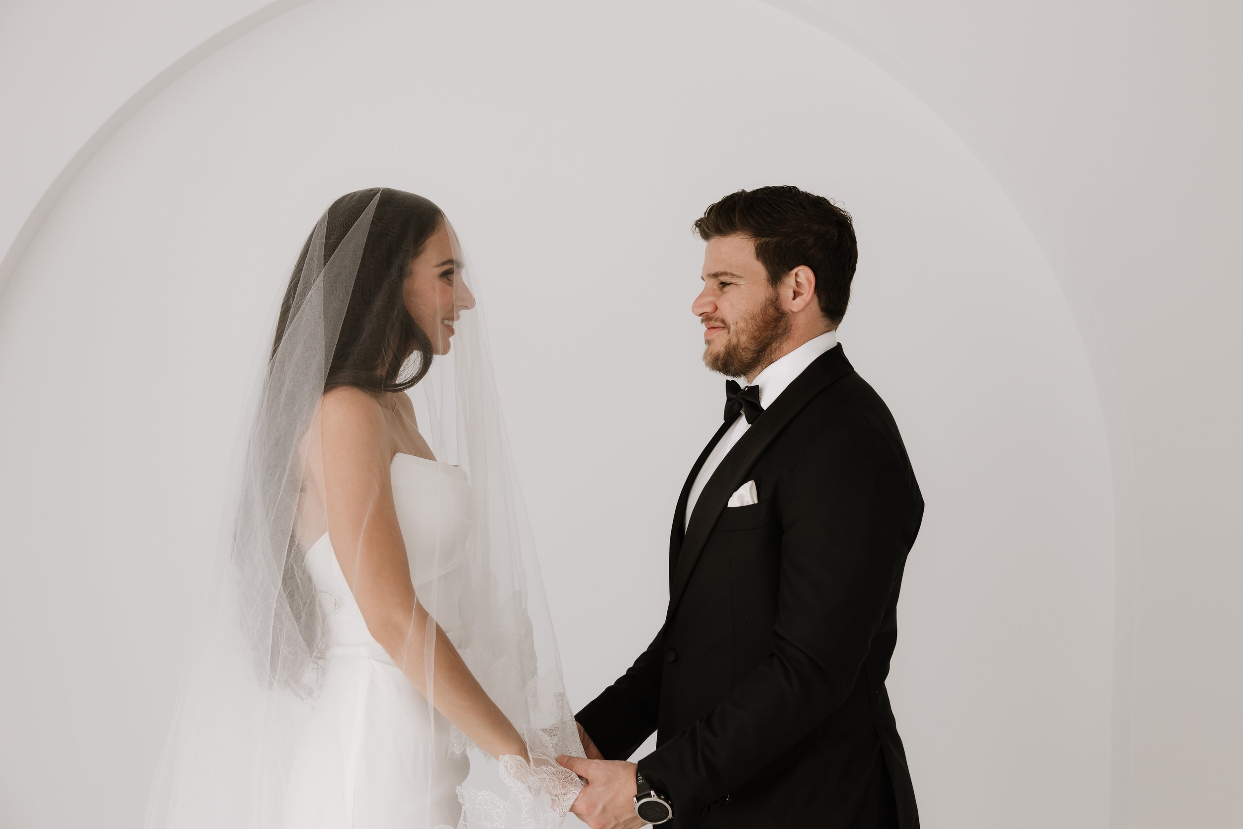 Natural light fills the studio through a custom floor to ceiling colonial window, complemented by high ceilings, an arched wall, and clean architectural details.